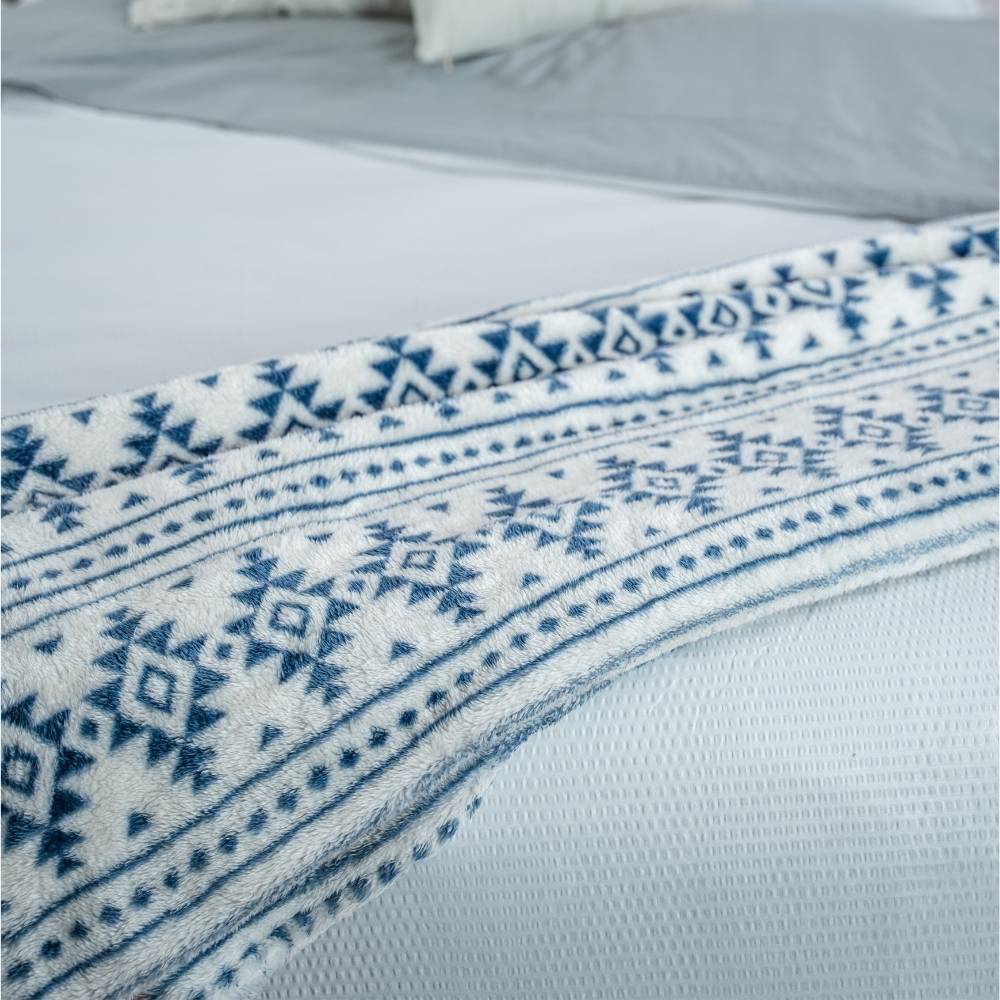 Envuélvete en la comodidad absoluta. Esta cobija de textura polar es tu pase directo a una noche de paz. Su hermoso patrón invernal Etnico crea el ambiente perfecto para tus momentos de descanso. Siente el abrazo suave y la calidez instantánea.