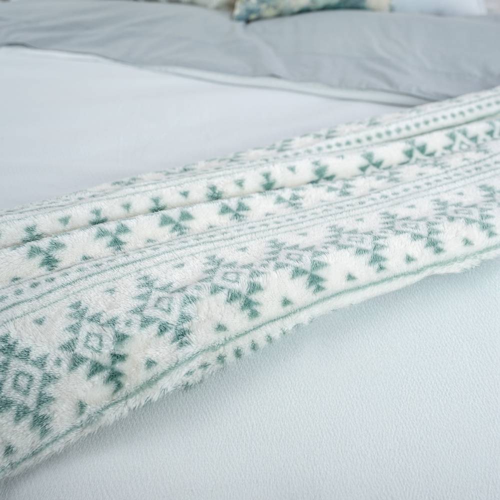 Envuélvete en la comodidad absoluta. Esta cobija de textura polar es tu pase directo a una noche de paz. Su hermoso patrón invernal Etnico crea el ambiente perfecto para tus momentos de descanso. Siente el abrazo suave y la calidez instantánea.